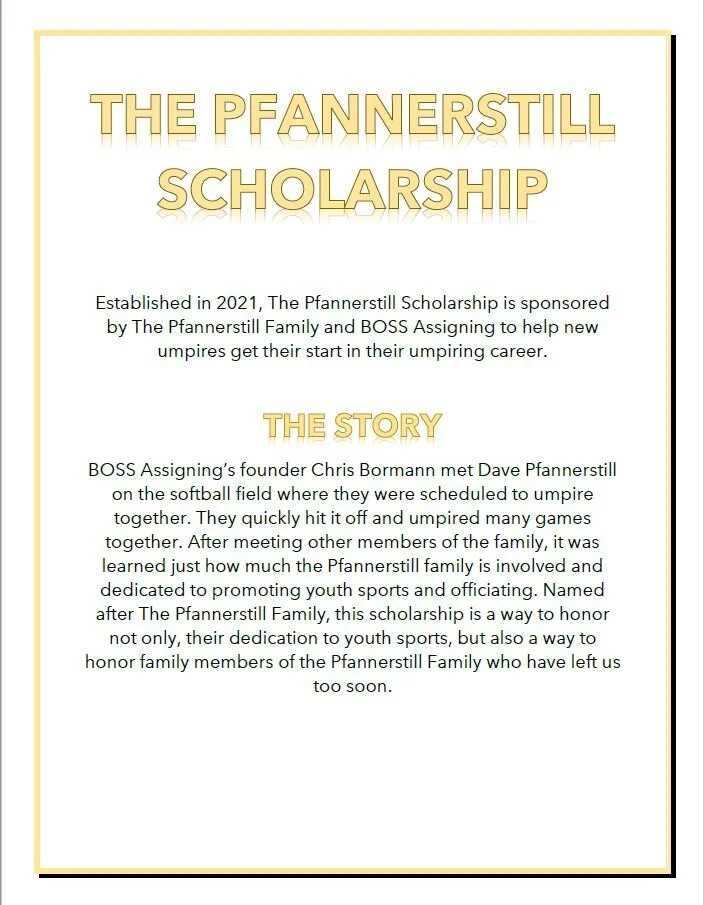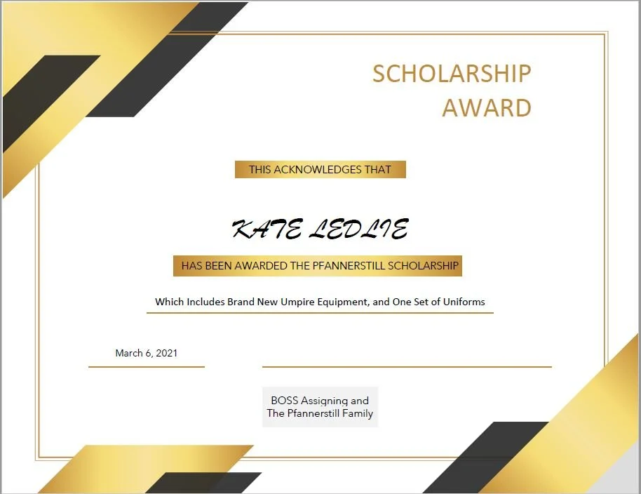 Tom decided to give umpiring a try. Never have umpired before, Tom started going to training sessions and asking the right questions, and listening to how to improve. Even though he didn’t have equipment, he wanted to learn more so he attended our camp. At the camp, he was presented with the Pfannerstill Scholarship to help him get his officiating career started. At the camp, Tom had a chance to use his new equipment and did a great job. Congratulations Tom!